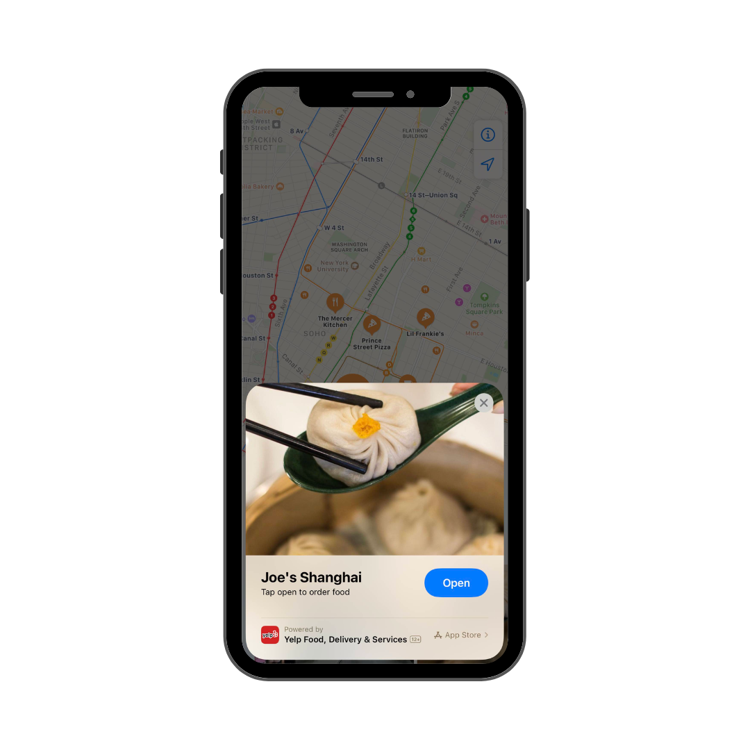 86 % des adultes américains se font livrer leur dîner chez eux au moins une fois par mois (Gloria Food, 2023). Et Yelp est déterminé à les aider à y parvenir plus rapidement et plus facilement. Imaginez-vous. Vous sortez d’une dure journée de réunions, votre ventre crie famine. Vous ouvrez votre frigidaire, plein d’espoir … sauf qu’il est vide. Désespoir. Votre regard s’illumine : quelle bonne occasion de commander ! Sauf que c’est déjà la troisième fois cette semaine … Un restaurant alors ? Cela fait une éternité que vous n’y êtes pas allé(e). Vous voulez évidemment quelque chose de bon, mais aussi quelque chose qui soit proche de chez vous. Vous ouvrez Maps et recherchez des restaurants. Joe's Shanghai a l'air très bien. Vous ouvrez les détails du restaurant sur Maps pour connaître les horaires, sauf que surprise, on vous propose de commander dans ce restaurant directement via Yelp. Vous cliquez sur “Commander”. Encore une surprise, l'application Yelp, que vous n'avez même pas téléchargée, s'ouvre, vous permet de commander et de payer votre repas. En 2-3 clics, le tour est joué, même pas besoin de créer de compte ! Sans le savoir, vous venez d'utiliser votre premier App Clip.