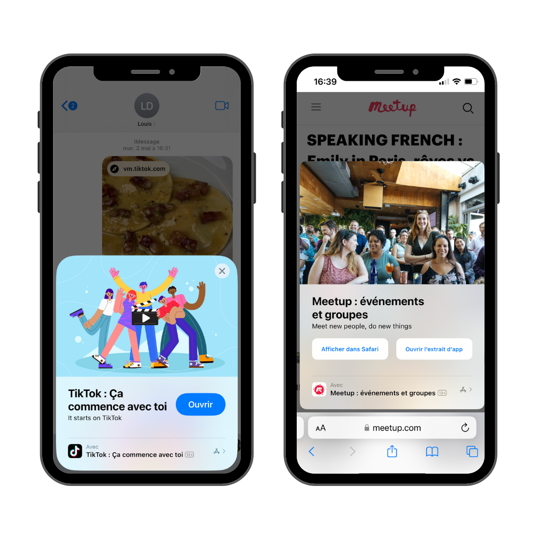 - demander à un proche de vous partager une vidéo TikTok via iMessage. L’App Clip est automatiquement proposé pour la lecture de la vidéo.