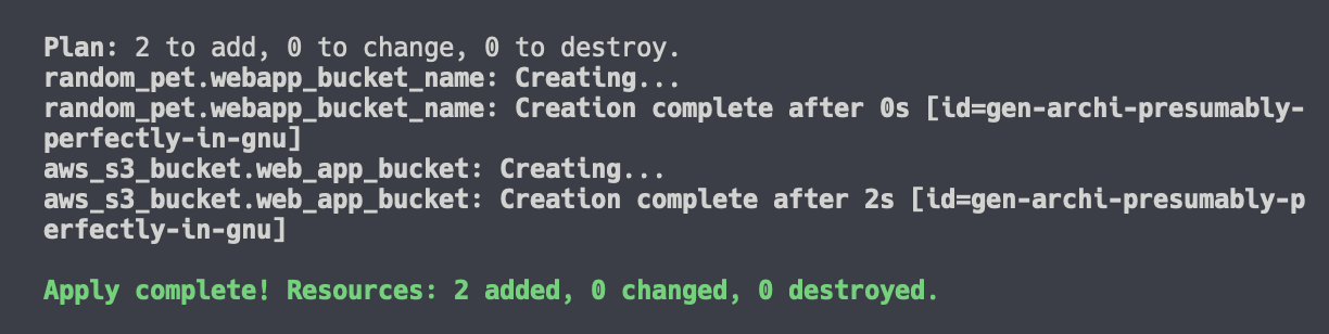 Nous nous attendions bien à avoir 2 ressources : un nom aléatoire pour notre bucket, (random_pet), et un bucket S3 (aws_s3_bucket).