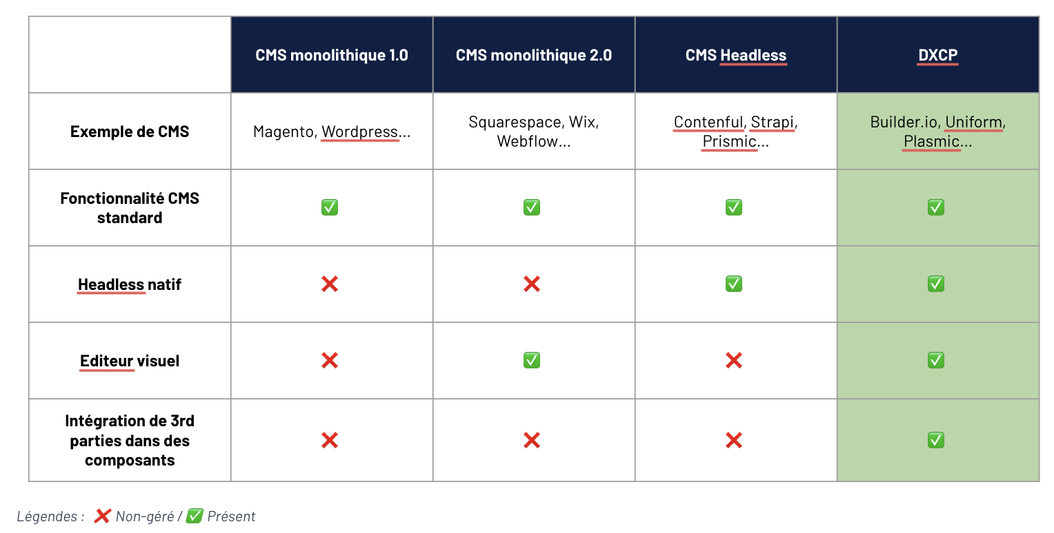 En résumé, la DXCP représente une évolution naturelle des CMS classiques intégrant notamment un éditeur visuel directement dans le front personnalisé afin d'améliorer la collaboration entre équipes techniques et non-techniques.