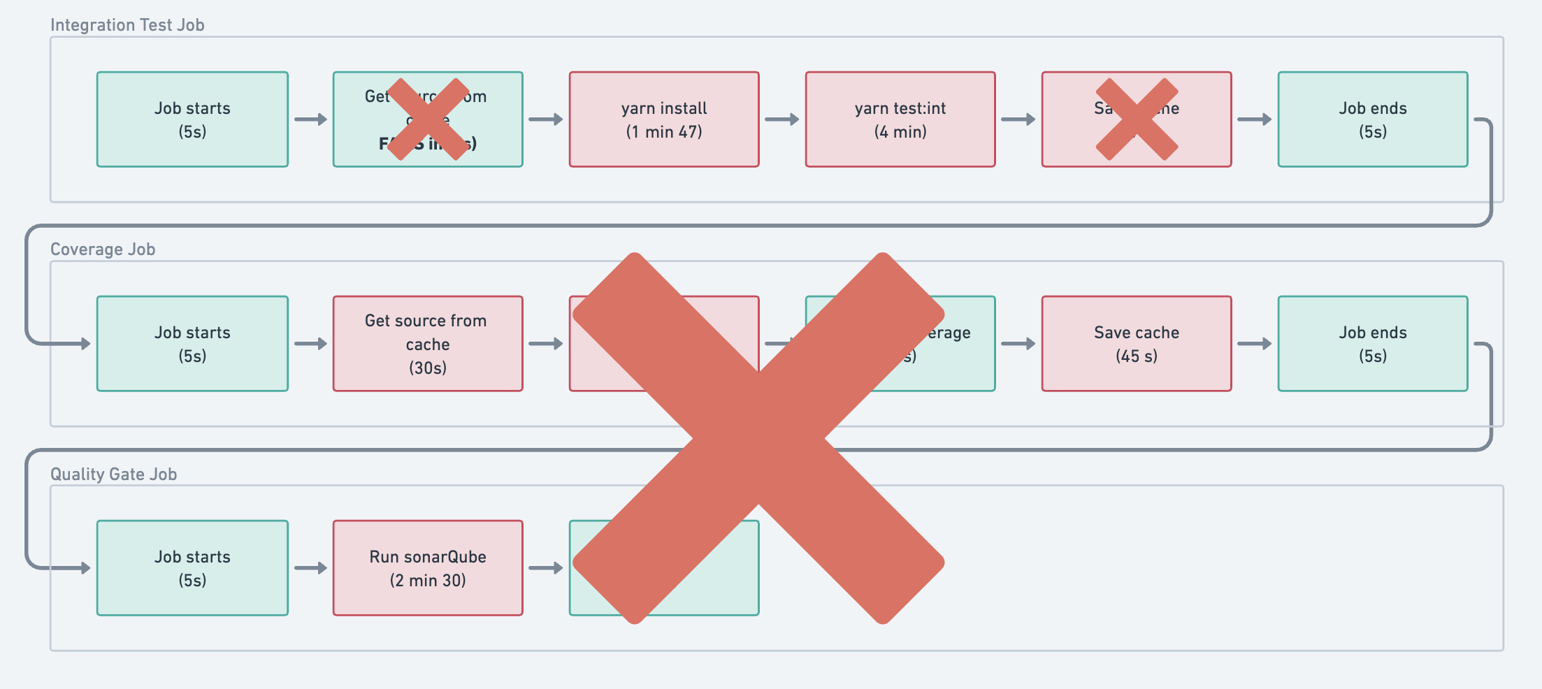 Il se trouve qu’après notre première modification, nous avons remarqué que nous n’avions plus besoin d’utiliser du cache entre nos différents jobs, puisque ceux-ci s’exécutent en parallèle. Notre optimisation revient donc à supprimer l’étape d’initialisation du cache !