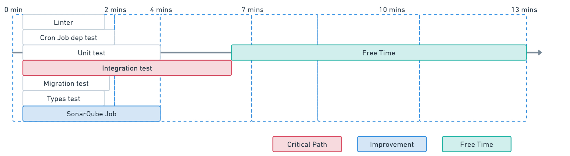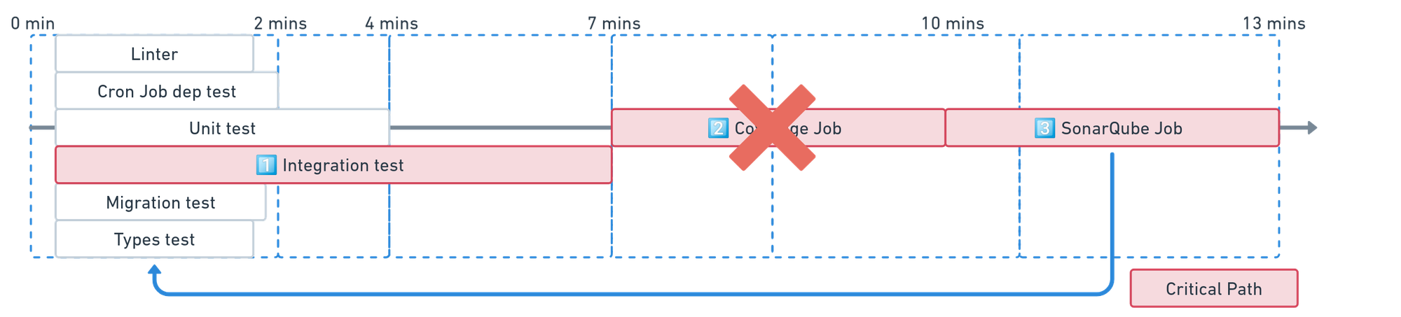 Dans notre CI, le premier job englobe divers tests, tels que le linter et les tests unitaires, exécutés en parallèle. Cependant, les tests d'intégration se distinguent par leur durée significative, impactant ainsi le chemin critique de notre CI. La question clé pour atteindre notre objectif est donc la suivante : "Pouvons-nous réduire le temps nécessaire pour exécuter les tests d'intégration ?”