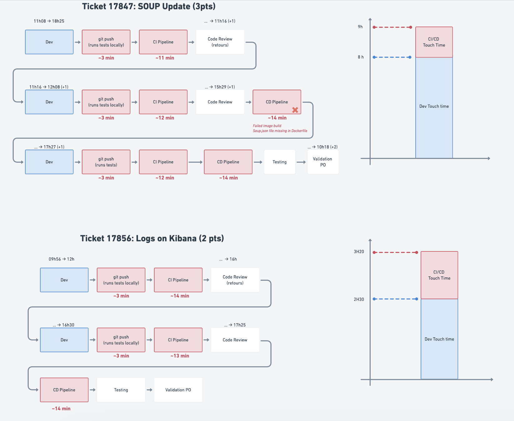 Notre Kaïzen s’est basé sur l’analyse détaillée de 2 tickets réalisés lors du sprint précédent, illustré dans le schéma suivant :