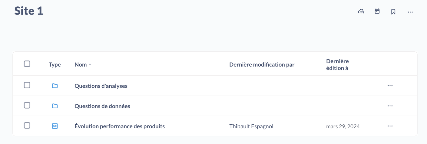 Trouvez une architecture qui convient à votre projet. Typiquement, sur mon projet, avoir un dossier par équipe, puis par site, et diviser chaque question par type ("questions de données" et "questions d'analyses" le premier dossier pour récupérer les données m’intéressant et le deuxième dossier pour créer les graphiques qui seront présentés dans mon tableau de bord) est suffisant, car nous n'avons pas beaucoup de questions. Mais si vous en avez beaucoup, je vous recommande de trouver une architecture plus spécifique.