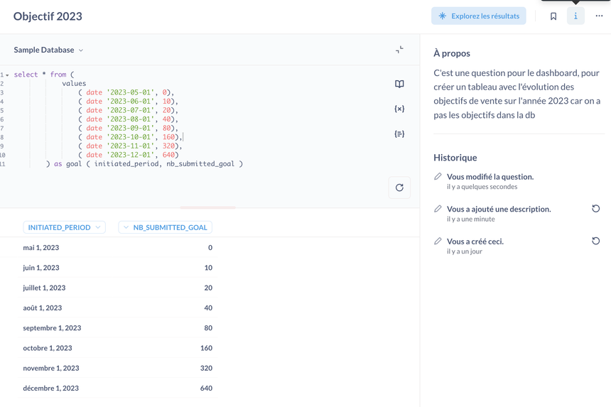 Essayez d'abord d'utiliser des options disponibles sur Metabase comme les colonnes personnalisées avant de recourir à une requête SQL. Ensuite, si vous devez créer votre propre requête, essayez de réduire son périmètre, utilisez une autre question dans votre question SQL, puis réutilisez-la dans une autre question de l'interface Metabase.
