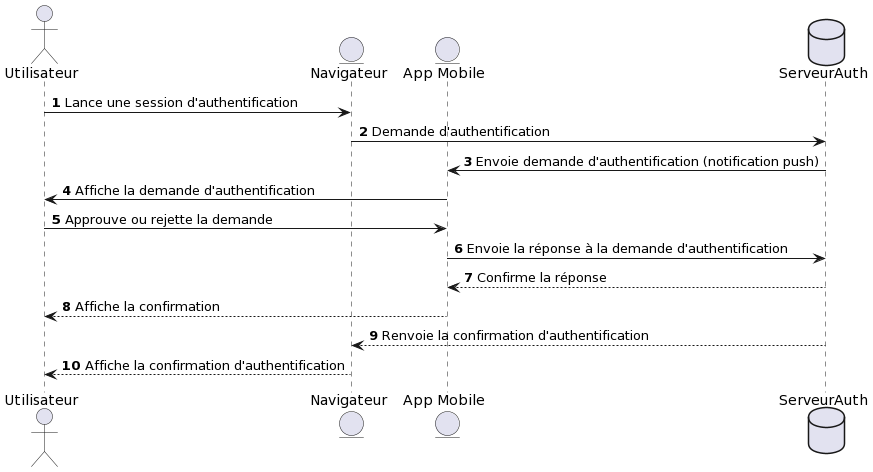 - Confirmation : Si l'utilisateur approuve la demande, un signal est envoyé en retour au service demandant l'authentification pour confirmer que l'utilisateur est bien celui qu'il prétend être.