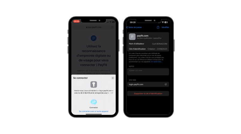 Grâce à FaceId, l'utilisateur récupère sa PassKey et l'utilise pour se connecter à Payfit.