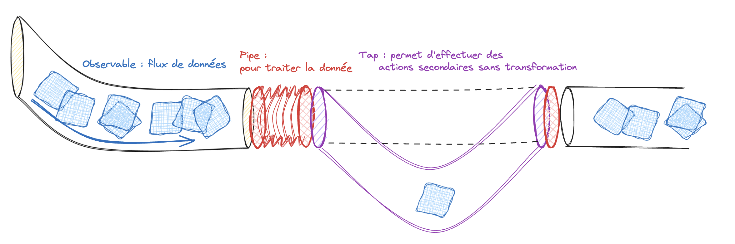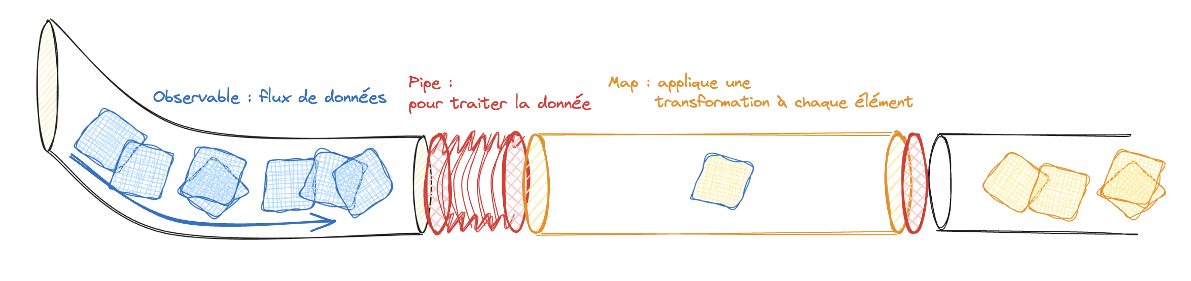 Le pipe, c'est le tuyau magique qui transforme votre eau boueuse en eau potable. Le pipe permet de connecter différents opérateurs pour transformer ou filtrer les données d'un observable avant qu'elles n'atteignent votre application.