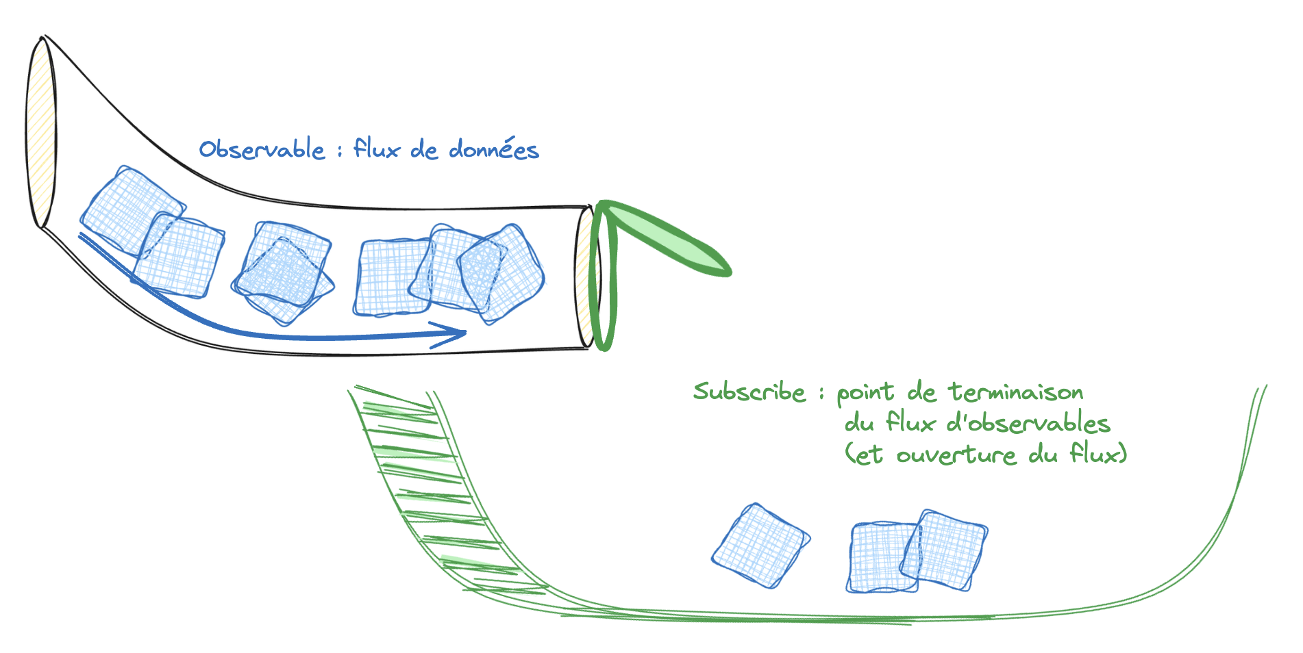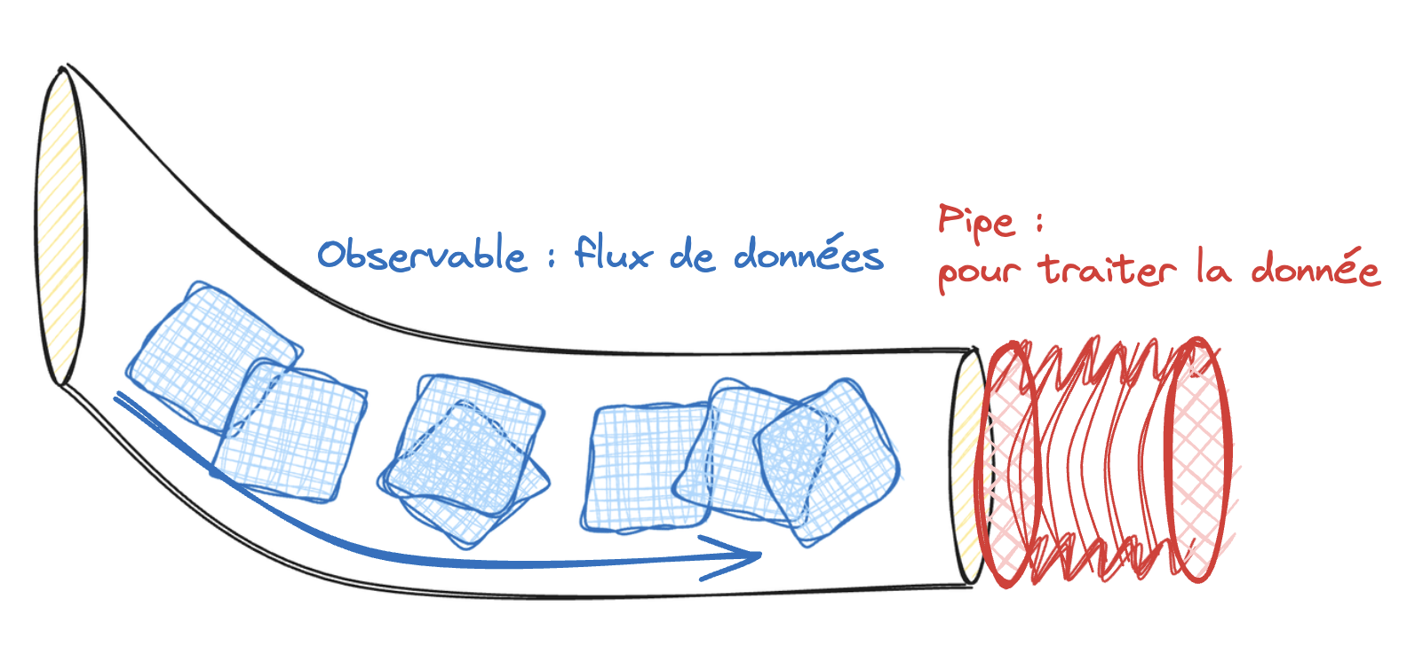Imaginez un observable comme un flux d'eau ou plutôt de glaçons dans un tuyau. Il peut émettre une série de valeurs au fil du temps, telles que des clics de souris, des réponses de serveur, ou même des mises à jour en temps réel.