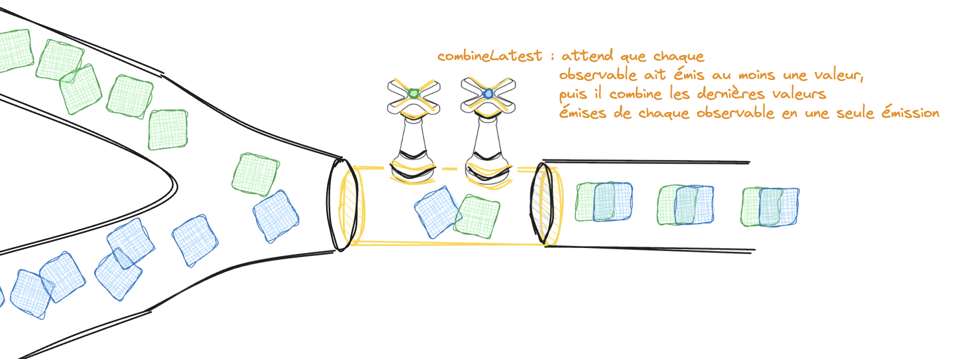 Imaginez que vous avez plusieurs tuyaux qui amènent chacun un glaçon de couleur différente : combineLatest vous permettrait de créer un glaçon multicolore à partir de tous ces tuyaux. C'est utile, par exemple, lorsque vous voulez synchroniser plusieurs sources de données avant de procéder à une action.