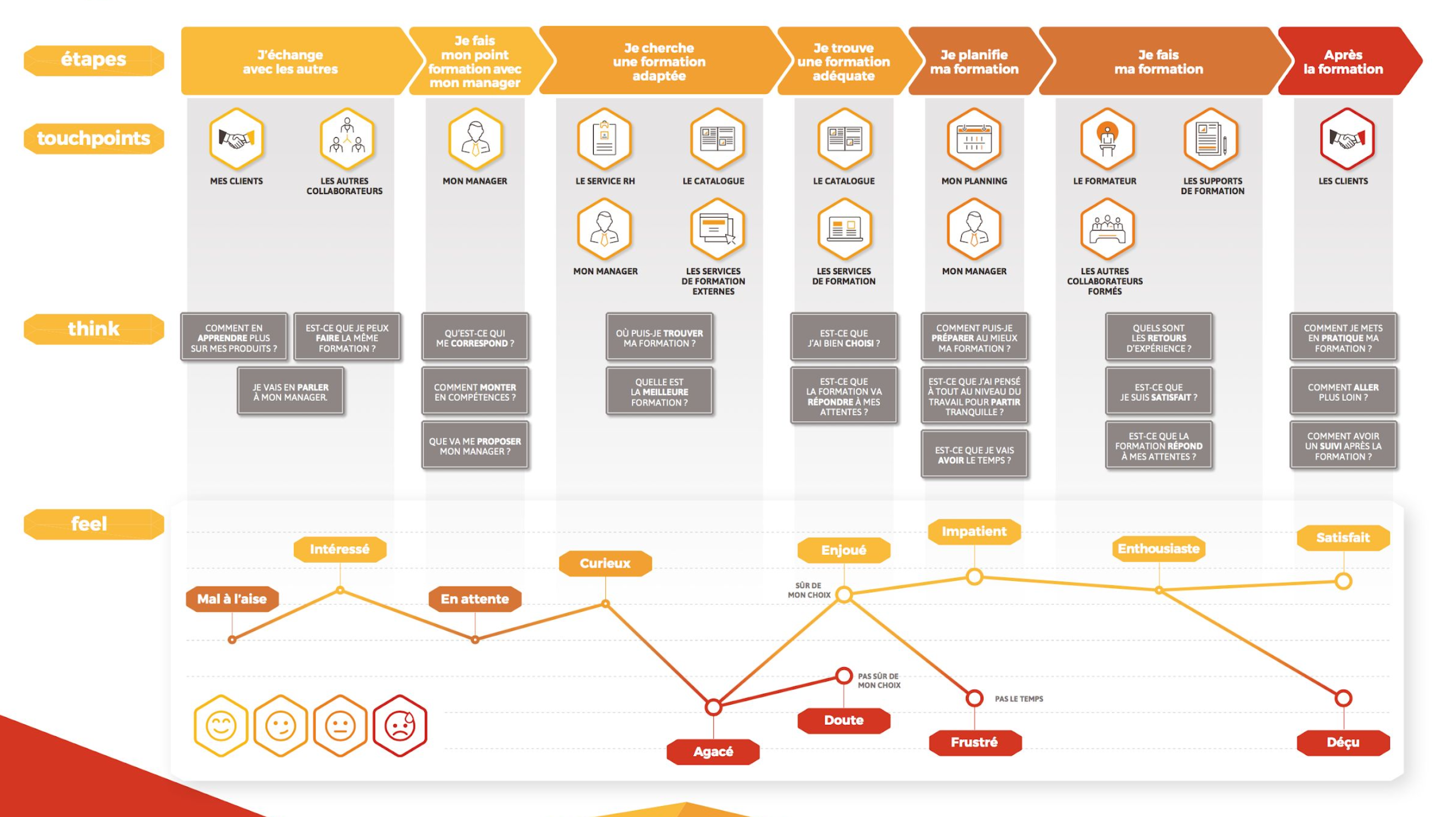 Exemple de template d’une User journey émotionnelle partagée lors de la formation. Le “Feel” prend une place conséquente dans ce fichier, en associant les émotions à des adjectifs concrets (vs des émojis sur les user journey classiques).