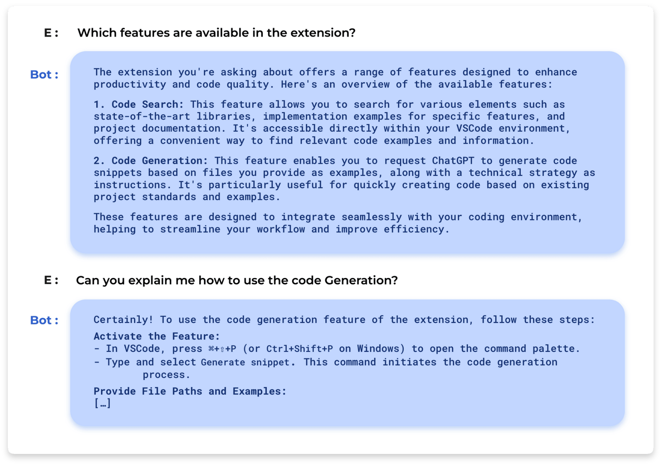 For instance, the AI team at BAM is developing a VS Code extension and I want a chatBot to be able to explain what this extension does and how to use it. Therefore, I created an assistant and I gave it the documentation of the extension in a PDF file. This is an extract of a chat I had with this assistant :