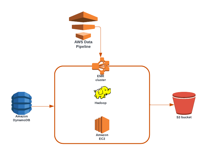 To migrate DynamoDB Data between different AWS accounts, we configured the Data Pipeline to use an EMR cluster. When a Data Pipeline runs, it creates some AWS EC2 virtual machines and installs a Hadoop cluster. Finally, it executes a script on the cluster to dump data from one AWS resource to another. This work is done in parallel by many workers. It sends finally a notification to the user with the execution status.