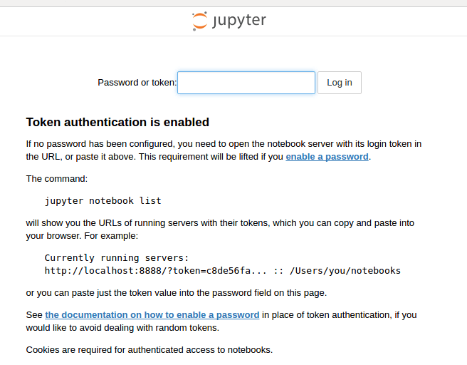 You will need to paste your token to identify and access your jupyter notebooks: 3299304f3cdd149fe0d68ce0a9cb204bfb80c7d4edc42687