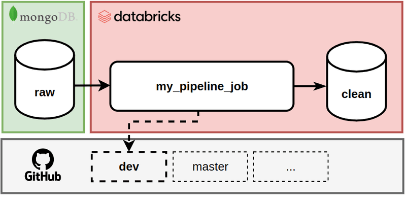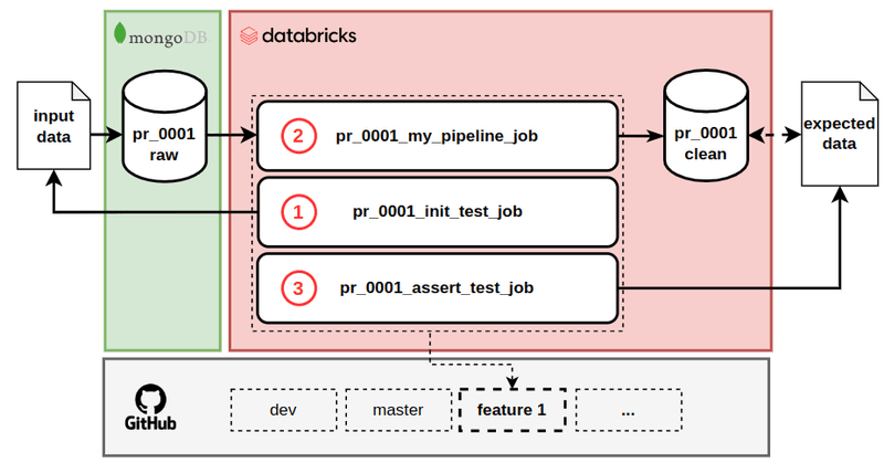 This pull request triggers an end-to-end test of “my_pipeline_job” in order to test the code of the “feature_1” branch. We want this end-to-end test to run on Databricks and test everything from reading from Mongo to writing into the “clean” database. It consists of the 3 following steps (see schema below):
