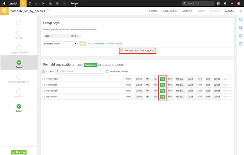 In the Group section of the recipe configuration, uncheck the count of occurrences within groups because you won’t need it. Select the average computation for all the metrics of each species.