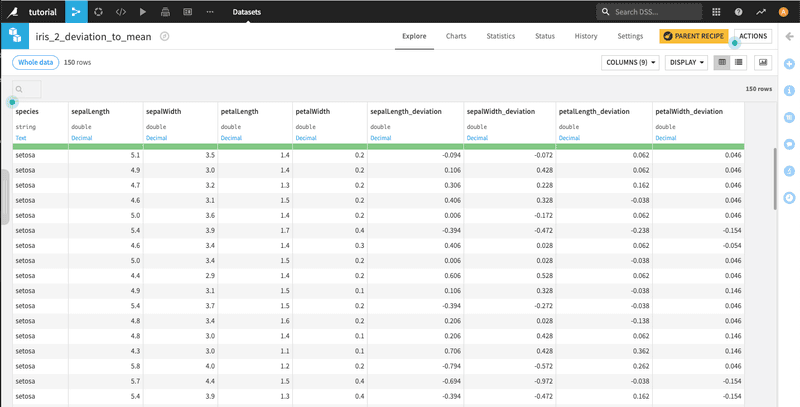 From the new dataset, create a Prepare recipe: add a first deviation calculation, and the preview is instantly displayed in blue in the dataset. Most important, the preview can be displayed for each intermediary step within the recipe. Preview feature really simplifies the review of changes as you make them, because you can view the state after each step within the recipe. Once you have many steps, this becomes your best ally for debugging!