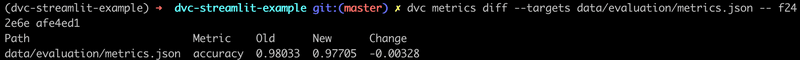 Additionally, dvc metrics diff let you compare metrics values between different commits:
