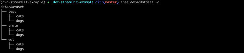 Now, if you execute the pipeline (run dvc repro dvc.yaml:split_dataset), you see the train/val/test splits: