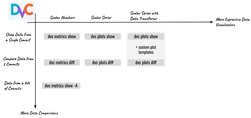 dvc metrics diffordvc plots diff; - define more complex data visualization by extending DVC plots with custom templates, it allows data transformations and interactive data visualization;