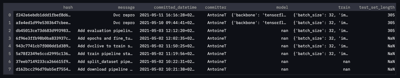 Note the paths argument: I am interested in commits that correspond to a DVC pipeline execution so I only need to keep commits that modified the dvc.lock file.