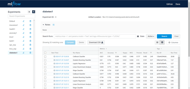 Many ML frameworks propose a UI that displays the list of experiments (i.e., training) with model parameters, training statistics, and model performance. For instance for MLFlow: