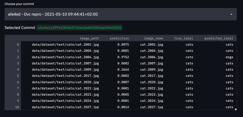 Provided a commit hash, the load_predictions() reads the corresponding prediction CSV file with pandas. Then, we use the commit selector to load the selected predictions and show them with Streamlit.