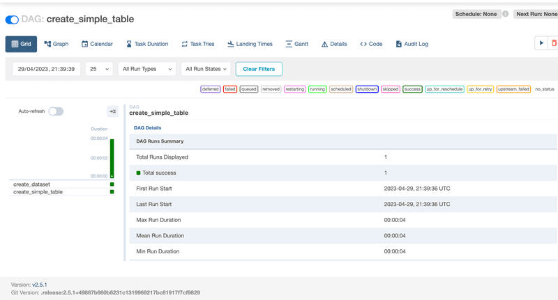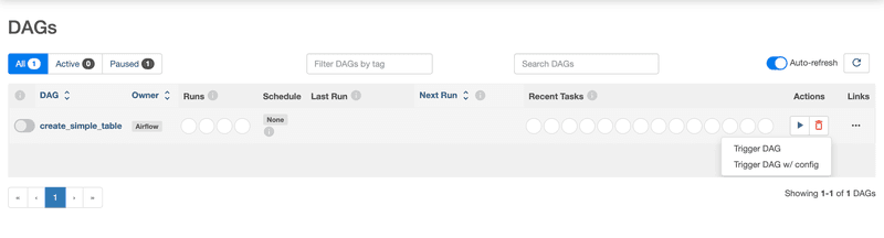 - In DAGs/Actions, click ‘Trigger DAG’ and ensure that the dataset and the table creations are successful.