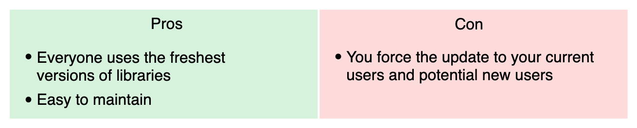 This is also the easiest solution for you, because you don’t have to maintain more than the usual. After the update, you can completely forget about the older versions of the ++code>super_dependency++/code> package and if anybody complains about it, they are in the wrong for not trying to update their dependencies, right? Well, it’s not really about who is in the wrong or not, but about offering the best experience to your users. Choosing this path still means that if someone doesn’t want to update its version of ++code>super_dependency++/code> for any reason, then they won’t get your updates neither. So this is actually not the ideal situation for your users because you force them to update the ++code>super_dependency++/code> package to get your new features.