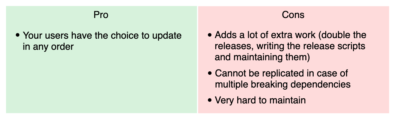 Unfortunately, as you probably understood, it’s the worst solution for you as it greatly increases the maintenance cost of your SDK. The main issue with this strategy is that it works well with one breaking change, but as soon as there’s another one, it doubles. If you rely on another dependency which also breaks, then you have 4 versions to manage. If you only do that for a few months though, it would become very unlikely that two unrelated dependencies break at the same time. But if it were to happen, your ++code>super_example++/code> package would become impossible to maintain. Supporting two versions of the same package can already lead to much more issues even with automation of the release process, but four would be an actual nightmare.