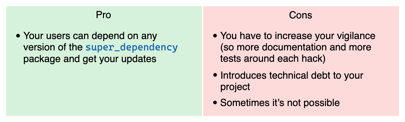 - Keep the old version of ++code>super_dependency++/code> to be able to continue using your package. It means they won’t get the new API and optimizations of the ++code>super_dependency++/code> package, so they are mad.