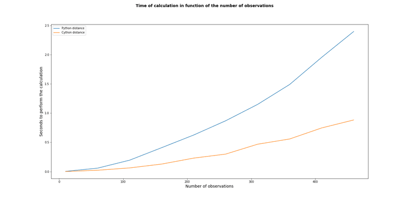 For the same distance (Euclidean) we compare the performance of python code vs cython code by running the previous code several time for a different number of observations. We can then plot the following graph.