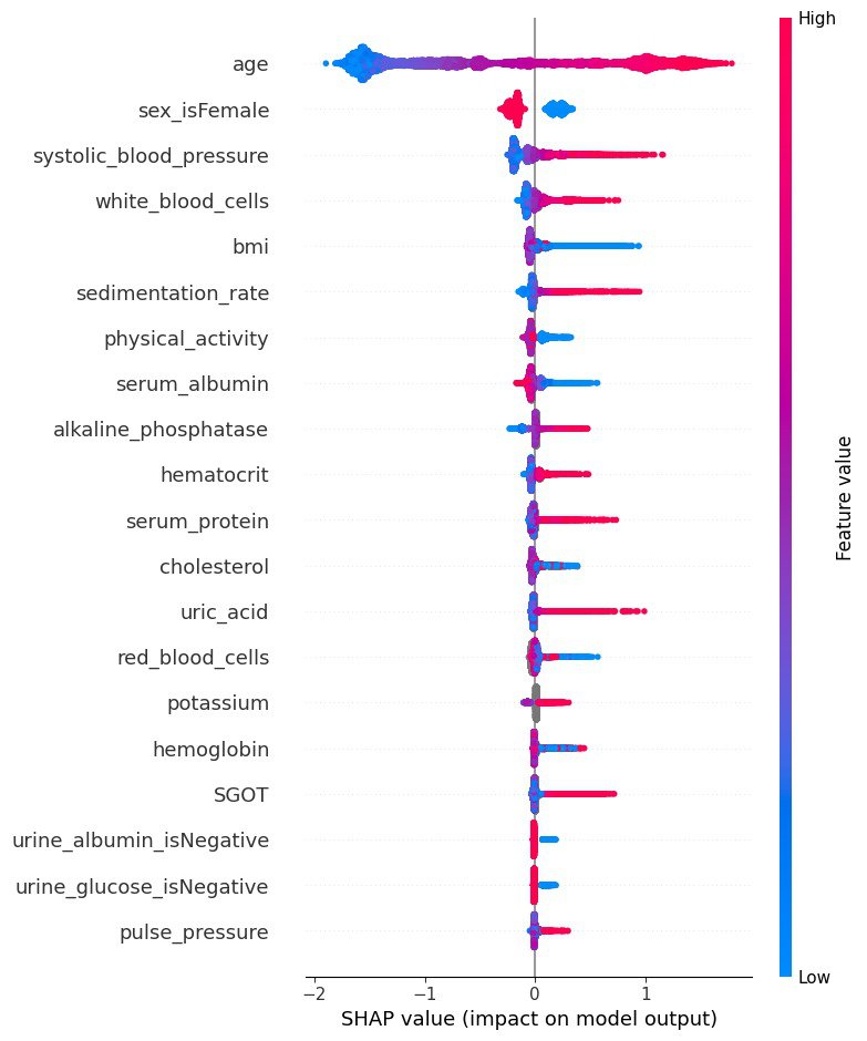 In the picture below, you have an example of the graphic you can have for a survival model. The use of colour helps illustrate the impact of changes in a feature's value. For example, an elevated white blood cell count correlates with an increased mortality risk.