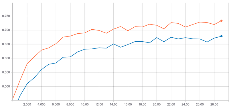 Above is a simple example using the CIFAR10 dataset with Keras. We have 2 different Convnets. They are composed of 2 convolutions blocks and 2 dense layers. Only the construction of a block changes. In orange, the blocks are composed of 2 normal 3x3 convolutions. In red, the blocks are composed of 2 separable 3x3 convolutions. Even if the separable convolution is a bit less efficient, it is 9 times lighter.