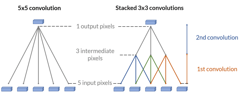 In 2012, AlexNet had a first convolution of size 11x11. In 2013, ZFNet replaced this convolutional layer by a 7x7. In 2014, GoogleNet’s biggest convolution kernel was a 5x5. It kept a first 7x7 convolutional layer. The same year, VGG, the 2nd prize, only used 3x3 convolution kernels. In the later versions, the 5x5 convolutional layer of the first version of GoogleNet has been replaced by 2 stacked 3x3 convolutional layers, copying VGG16.