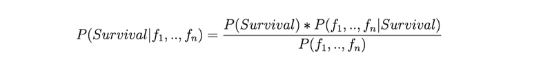 The Naive Bayes classifier is based on finding functions describing the probability of belonging to a class given features. We write it P(Survival | f1,…, fn). We apply the Bayes law to simplify the calculation:
