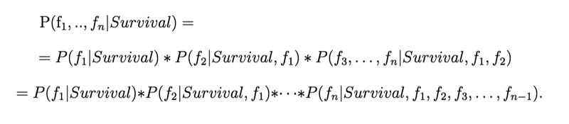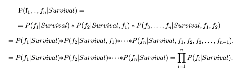 Each calculation of terms of the last line above requires a dataset where all conditions are available. To calculate the probability of obtaining f_n given the Survival, f_1, …, f_n-1 information, we need to have enough data with different values of f_n where condition {Survival, f_1, …, f_n-1} is verified. It requires a lot of data. We face the curse of dimensionality. Here is where the Naive Assumption will help. As feature are assumed independent, we can simplify calculation by considering that the condition {Survival, f_1, …, f_n-1} is equal to {Survival}: