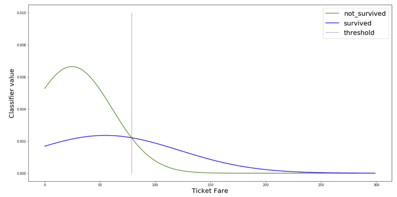 If classifier(Fare) ≥ ~78 then P(fare| Survival = 1) ≥ P(fare| Survival = 0) and we classify this person as Survival. Else we classify as Not Survival. We obtain a 64.15% performance classifier.