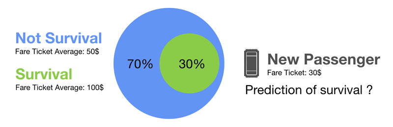 Imagine you take a random sample of 500 passengers. In this sample, 30% of people survived. Among passenger who survived, the fare ticket mean is 100$. It falls to 50$ in the subset of people who did not survive. Now, let’s say you have a new passenger. You do not know if he survived or not, but you know he bought a 30$ ticket to cross the Atlantic. What is your prediction of survival for this passenger?