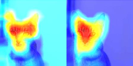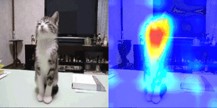On the animation below, we run a blue patch over a cat image and extract the confidence at each step. When the patch goes over the cat, confidence drops, so we can identify the region behind the patch as hot. When the patch does not occlude the cat, the confidence stays even or eventually goes up. This happens because we potentially hide elements that degrade the performance.