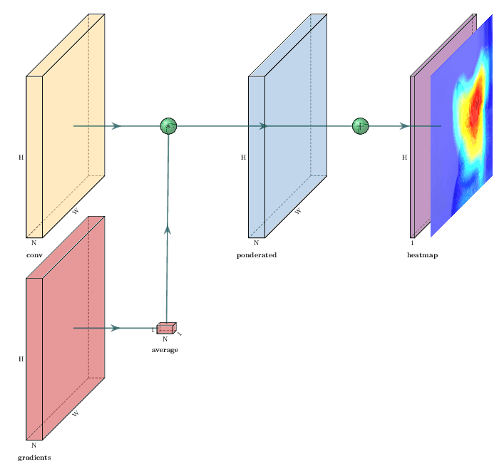 Given those convolutional filters (of shape WxHxN), we compute the gradients towards the class score (same shape WxHxN). To establish the importance of each filter in the decision, we take the average of its weights (with shape 1x1xN) as a judge, and multiply each map by its corresponding weights. Then, we sum up all those ponderated maps into a final heatmap. If an activation map has been lightened up during forward pass, and if its gradients are large, it means the region which is activated has a large impact on the decision.