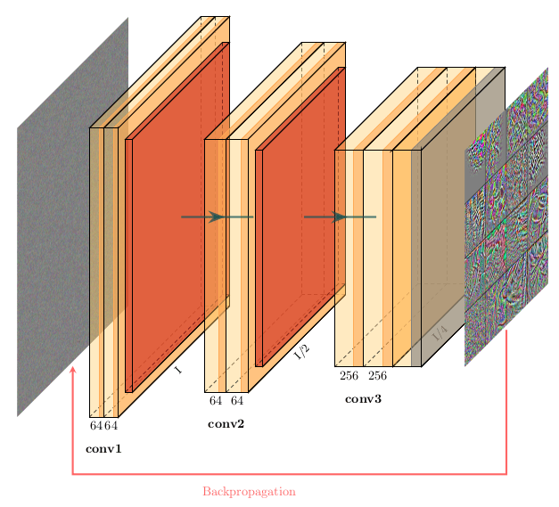 The idea behind this visualization is to generate an input to the network that maximizes the reaction of a given kernel filter. Therefore, we create a sub-model which stops at the target layer. The loss function we seek to maximize is the mean of this activation layer’s output. The starting point is taking some random noise as input. Then, we backpropagate the gradients to perform gradient ascent on the noise. Iteratively, we build an input that makes the filter’s reaction stronger and stronger.