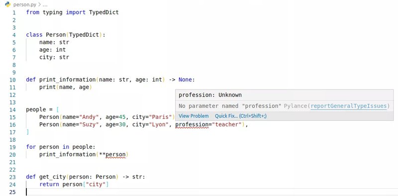 If we think that we’re done, we can run mypy on our script: we get the error person.py:12: error: Missing key "city" for TypedDict "Person" which indicates that the “city” argument is missing in our instantiation of Andy and Suzy. If we had tried running the script, we would have gotten an error - instead, we detected the mistake before anything bad could happen.