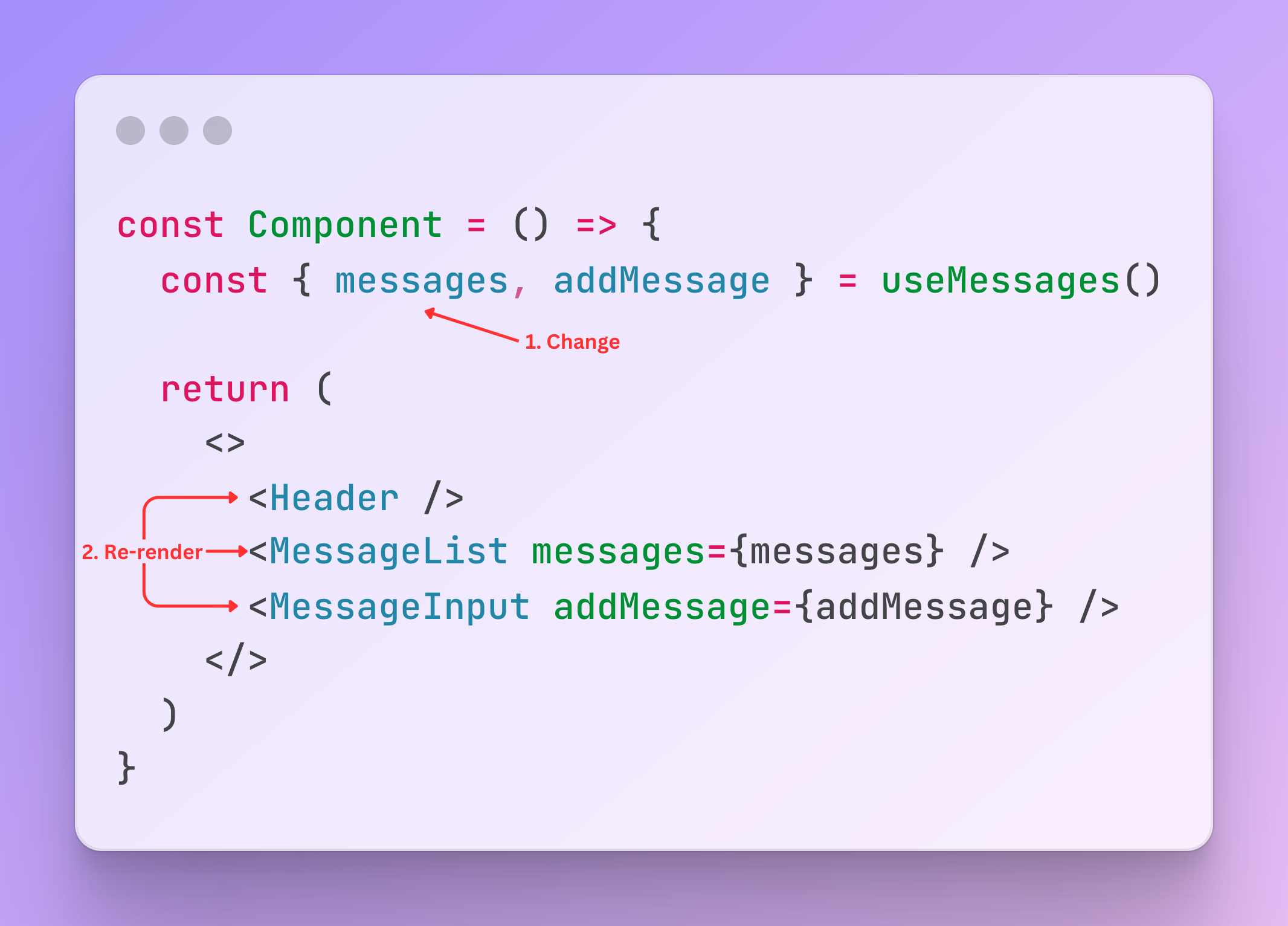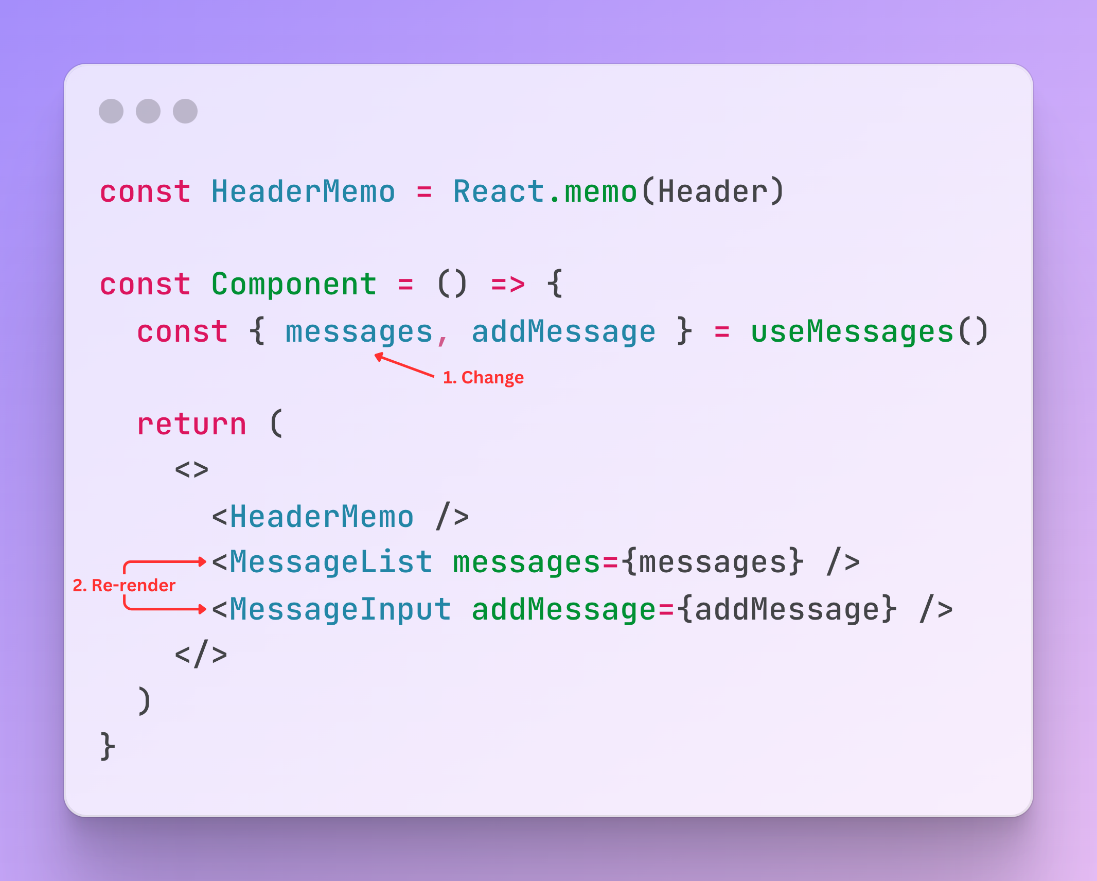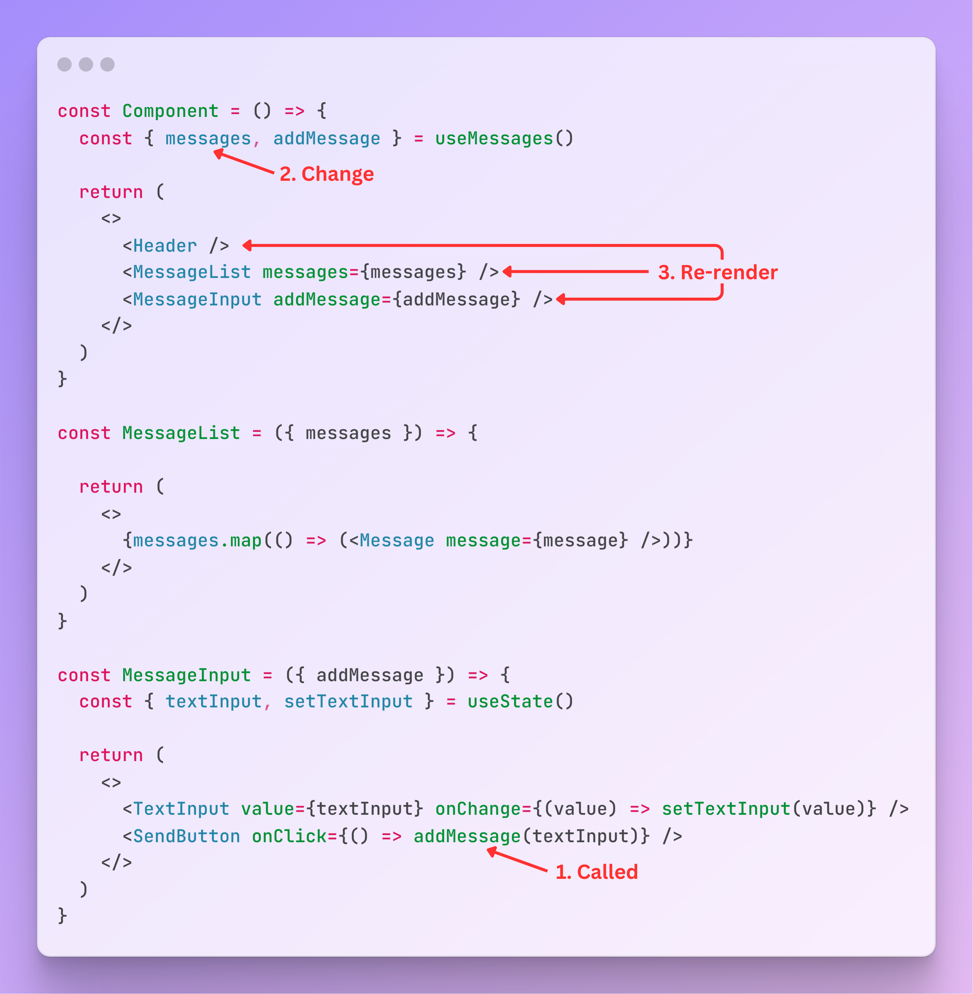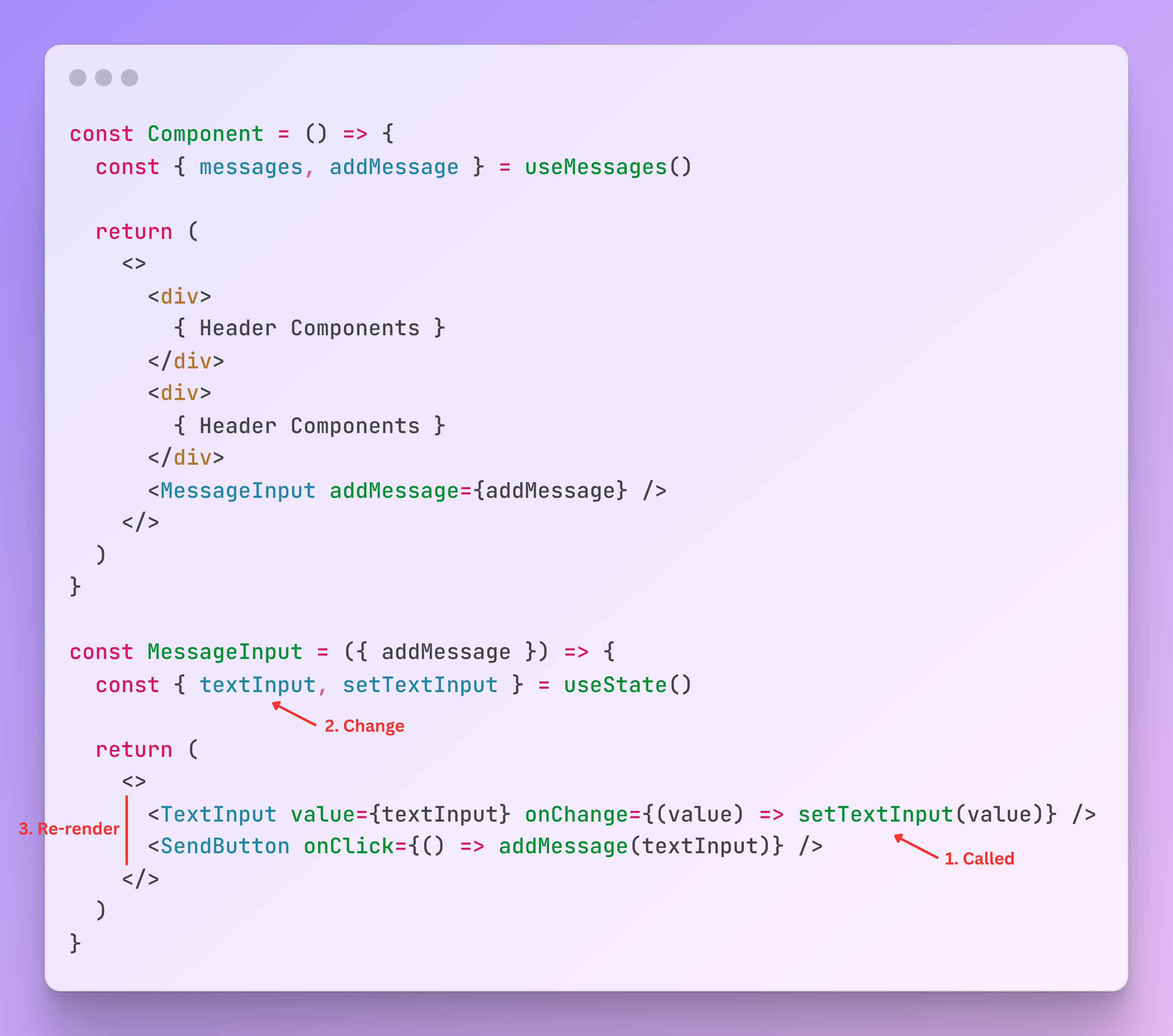 In this example, every time the user sends a message, the components Header , MessageList and MessageInput are re-rendered.