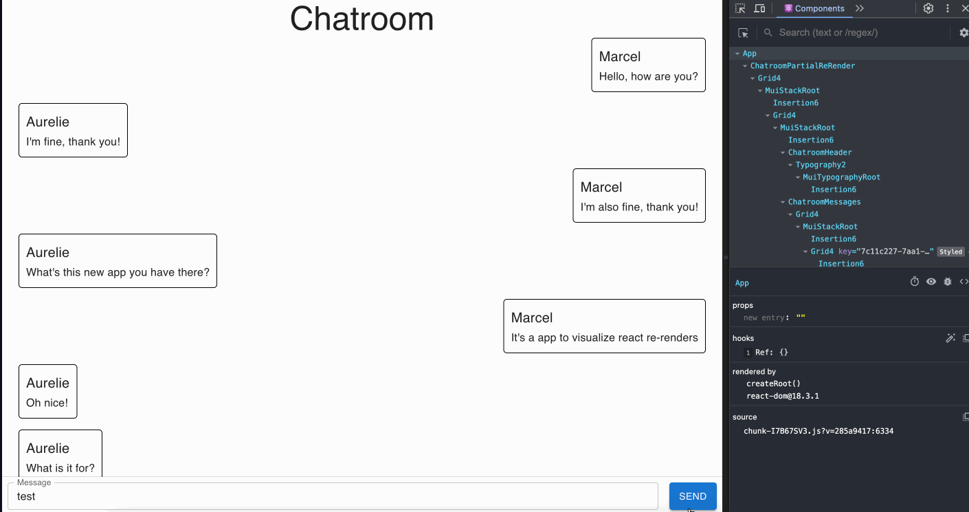 In this example, every time the user clicks on Send the list of messages is updated, leading to the re-render of the Header, the MessageList and the MessageInput.