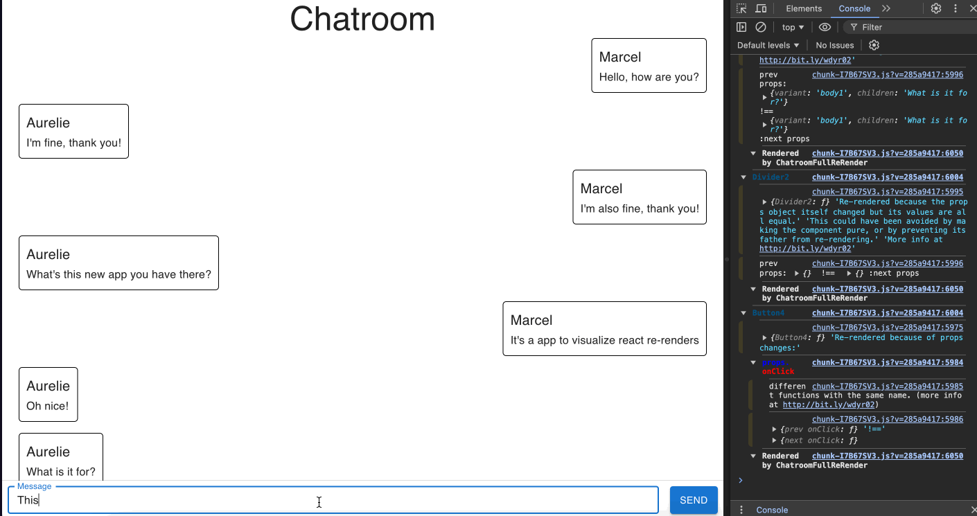 - React DevTools: The React Developer Tools extension contains the feature "Highlight Updates" which visually indicates which components re-render by adding a colored border every time it is re-rendered.