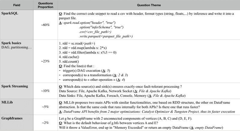 Questions are mainly divided into 5 Spark fields. Following is a summary of what you will be confronted to: