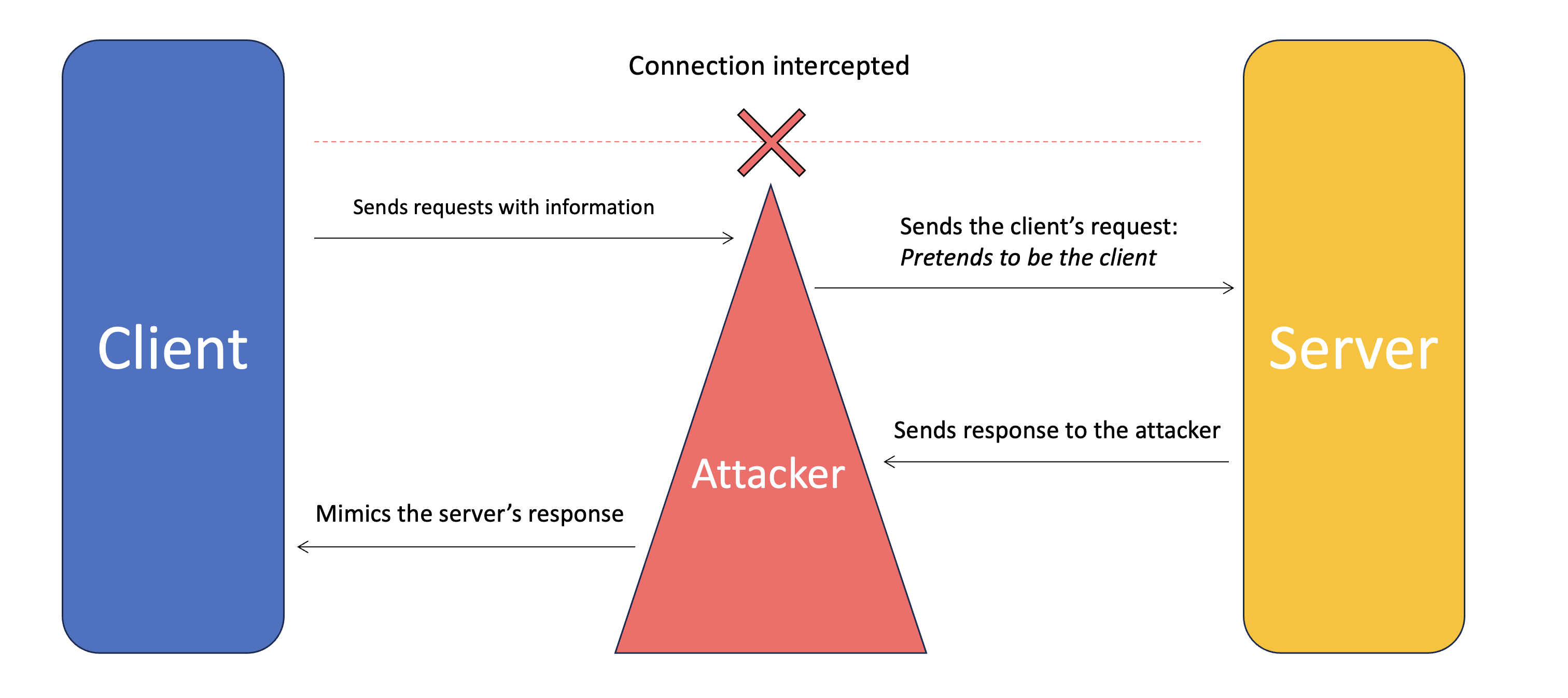 Steps 2 and 3 of the handshake phase are especially relevant to our topic. A certificate works like your ID card, it is delivered by the server to ensure its trustworthiness. Certificates are delivered by certificate authorities (CA). CAs play a crucial role in establishing secure communication by confirming that a website or entity is legitimate and can be trusted in online transactions. The client does not immediately trust the server, but it trusts CAs ! And here comes the threat of MITM attacks…