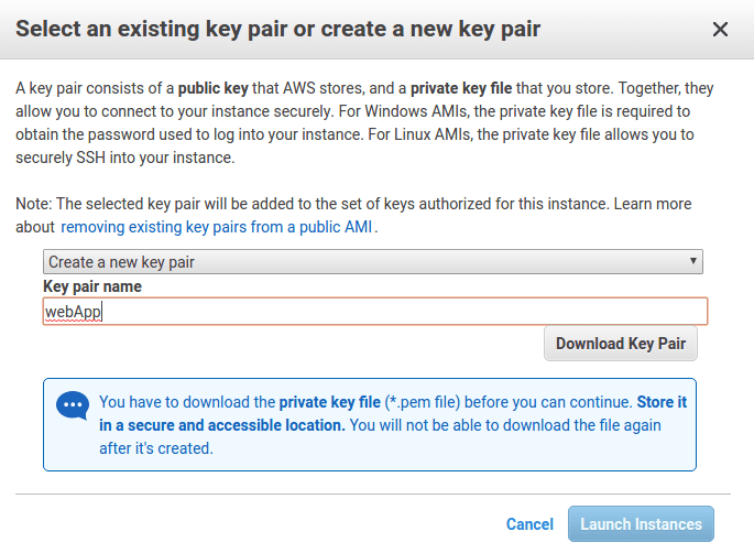 This step is extremely important to connect to your EC2 machine ! Choose to create a new key pair, name your key pair webApp, and download it, then view instance. Congratulations, you have launched your AmazonAWS instance. The next step is to try to connect to this instance.