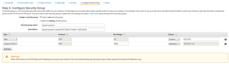 We need 2 network rules, the ssh rule on port 22, source custom and the custom tcp, port range 3000, source anywhere, then launch your instance ! This step is important to reveal the port 3000 to the world on tcp, and the port 22 on ssh.